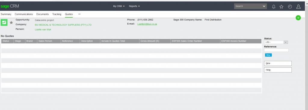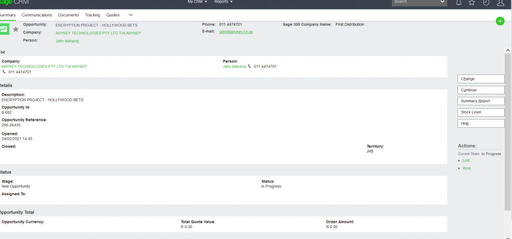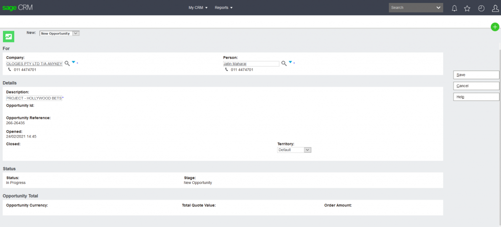 • Select Save Button – the opportunity has been created, which can be identified with an OPP ID