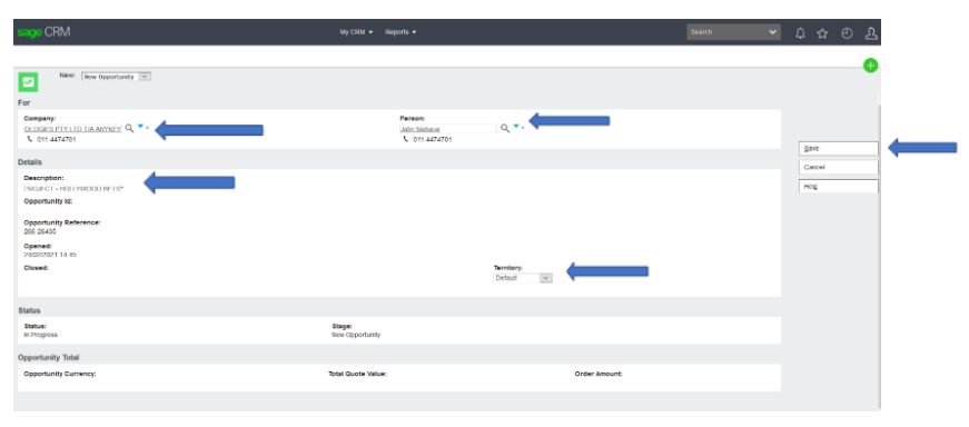 Select Save Button – the opportunity has been created, which can be identified with an OPP ID