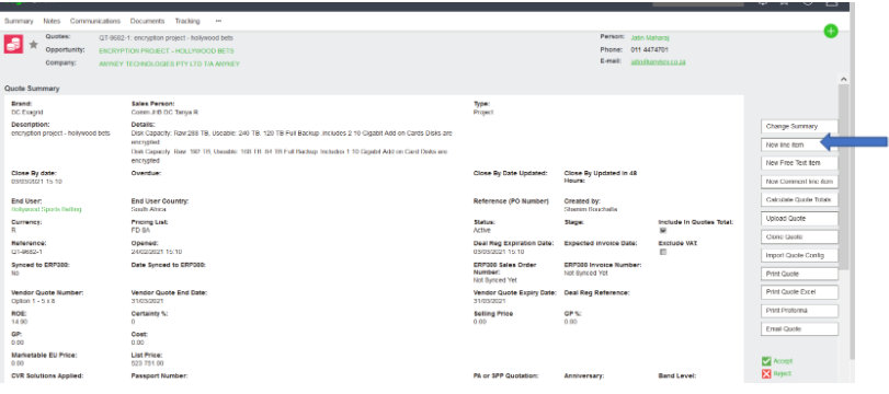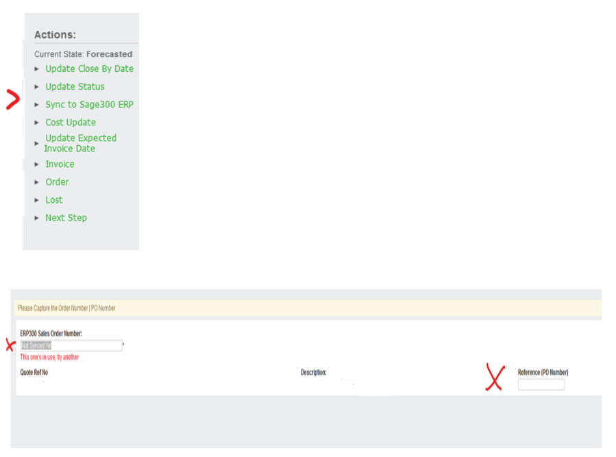 Step 2 – We go back to Quote and Sync to Sage 300 ERP and add Sales Order Number and PO number if not already there