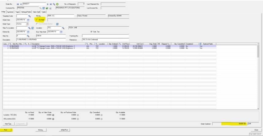 Step 3 – Open AccPac – enter SO number and tab. If Acc is on hold, send an email to Order Release with any approvals.