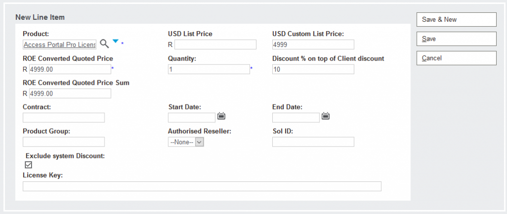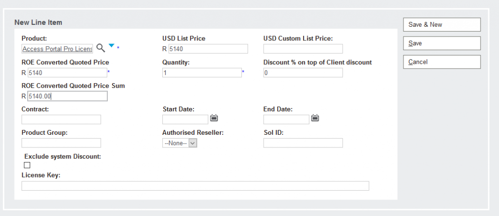 Once the code has been found, the description will be underlined. The USD List Price block will populate automatically. Put in the quantity required. The rest of the blocks will automatically be calculated in accordance with the ROE and qty provided by you. Click on the Save & New or Save button to enter a new line item.