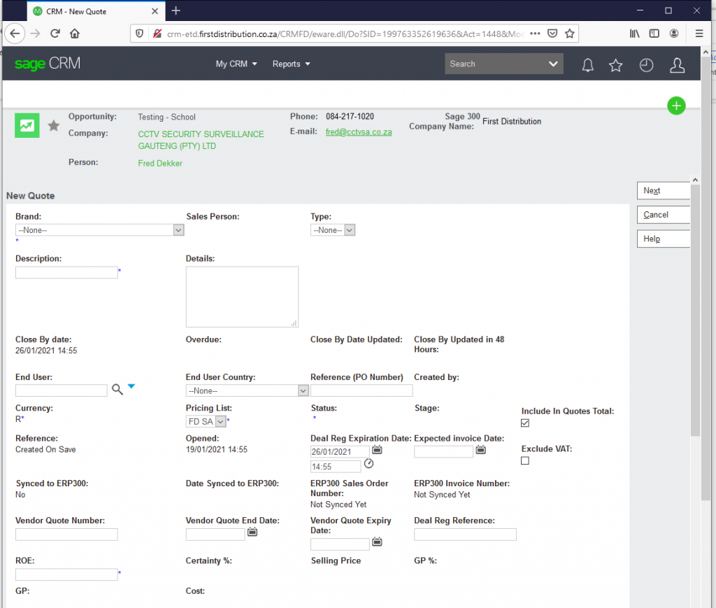 • Fill out the End User. NB – The End User needs to be created on the system if not already. This can be done by sending it to the Code Creation Team to upload. If the End User has not been loaded at the time of quotation, select TBC (To be confirmed). This will allow you to proceed, however, it remains your responsibility update once the code has been loaded onto the system.
