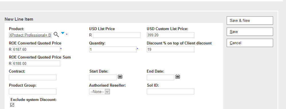 If you have Project discount for milestone, you will need to clear the USD List Price, Take the MSRP as per your Milestone quote, and minus the Partner discount. You will then manually enter the USD Custom List Price. Add the Project discount that you received from Milestone to the Discount % on top on Client discount. Click on the Exclude system Discount block as indicated below. If there is no Project discount, leave the MSRP as is.