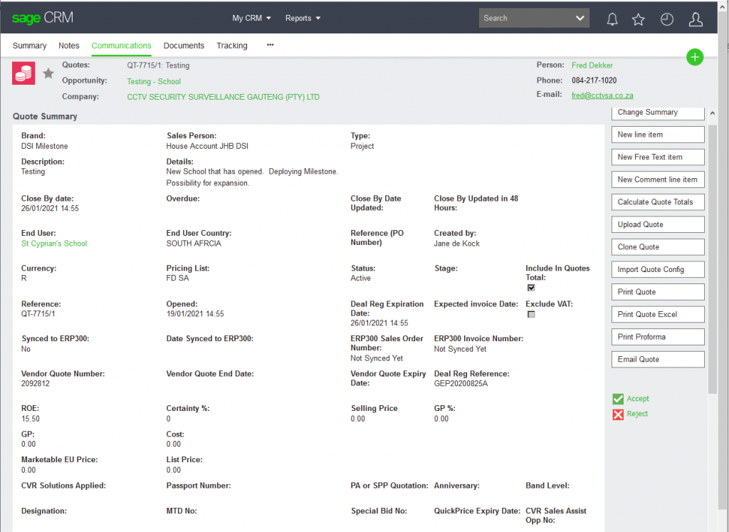 Click on the Save & New button if you wish to add more line items or click the Save button once done. Once done and you have clicked Saved – the next page will load. To see the totals, you would need to click the Calculate Quote Totals button. After Quote totals have been updated, click the Accept button that appears on the right-hand side of the screen.