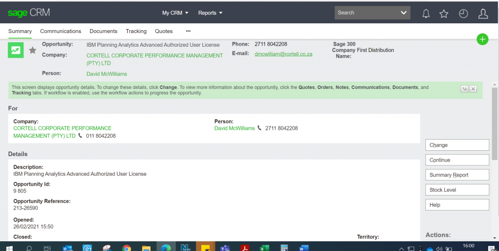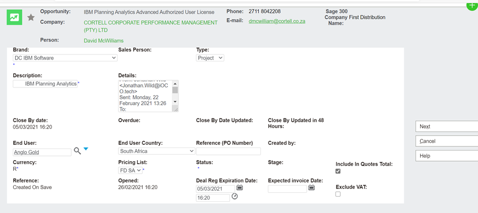 Add partner, then contact person and complete the description box with a short description of the opportunity. Territory stays on Default. Click save and the opportunity will be created created.