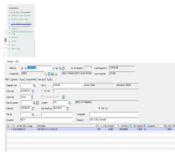 Go back to the quote summary and insert the PO number, save and click on sync quote on ERP300 to convert the opportunity and order.