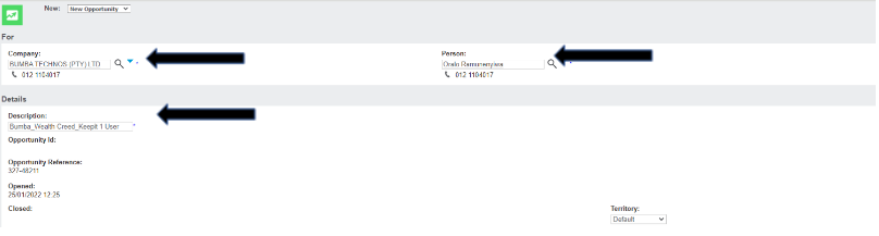 Add partner then contact person and Complete the description box with a short description of the opportunity.  Territory stays on Default.  Once save has been clicked an opportunity has been created. Ensure the territory is updated correctly (should not say worldwide)