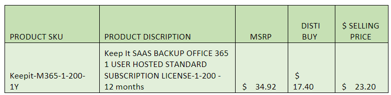 Take the Disti buy price on the Keepit Price list and divide it by 12 months to get $ the amount for each month. Take that price and multiply it by the months left over in the co-term and add 25% margin.