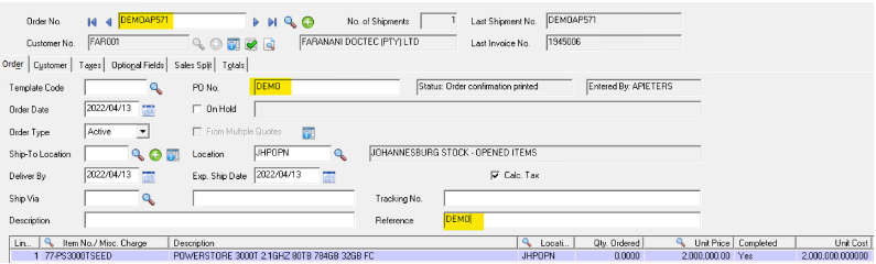 (EG DEMO SM005) - “under customer PO” type “DEMO” as the PO Number