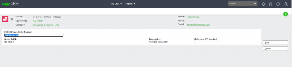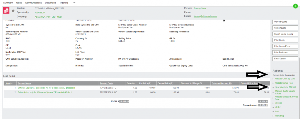 - Click on Sync Quote to ERP300 (Accpac)
