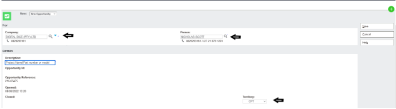 Add a partner, then contact the person and complete the description box with a short description of the opportunity. Territory stays on Default. Once save has been clicked, an opportunity has been created. Ensure the territory is updated correctly (should not say worldwide)