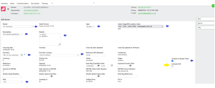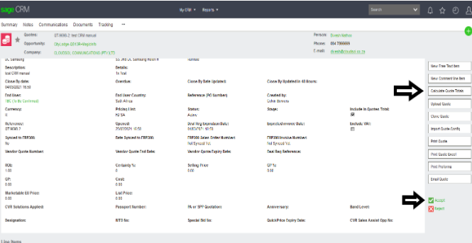 - Once the quote is correctly populated, select Calculate Quote Totals to calculate your margin and Total amount, as well as the GP and Margin %