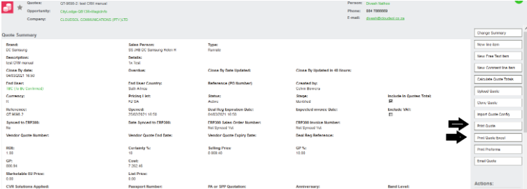 - In order to generate the quote to the client and/or to sales, click on the print quote button